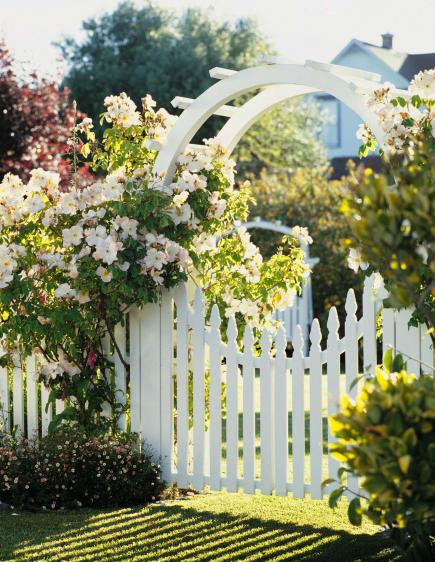 A classic white picket fence needs a beautiful white picket gate like this...with a rounded arbor for trailing, flowering vines.